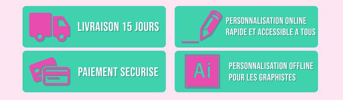 La combinaison de ces composants nous permet d’offrir une large gamme d’emballages de qualité, disponibles en petites quantités et livrés rapidement (MOQ de 50 unités et une livraison en 15 jours).